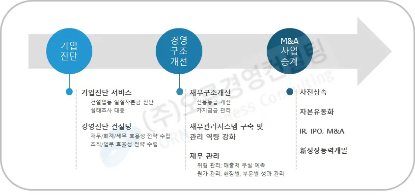 중소기업의 현실을 이해하고 우리 회사를 대표님보다 더 잘 알고 있는 전문가가 있다면 어떠시겠습니까? 저희와 함께 하십시요. 대표님의 고민을 덜어 드리고, 회사의 중요한 일을 집중 하실 수 있는 시간을 만들어 드리겠습니다.