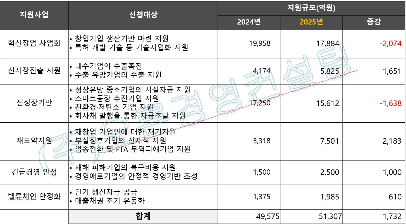 전반적인 자금 규모는 줄지 않은 듯 보이나, 세부 내용을 보면 상당한 변화가 있어 보입니다. 이와 중에도 재도약지원자금은 증가 되었는데 유심히 살펴보시기 바랍니다.