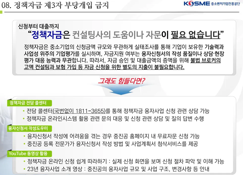 정책자금은 브로커를 쓰지 마시고, 직접 신청 또는 신뢰할 수 있는 전문가와 함께 하시기 바랍니다. 물론, 사업하시느랴 바쁜 시간에 이런 것까지 어떻게 챙기느랴하시는 상황도 어느 정도 이해는 합니다만, 자금 조달과 조달 금리 등은 기업을 운영하면서 정말 중요한 것이므로 직접 챙기시는 것이 무엇보다 중요합니다.