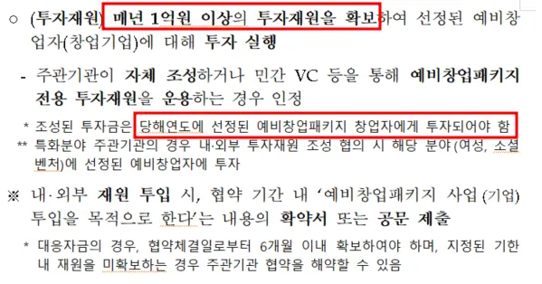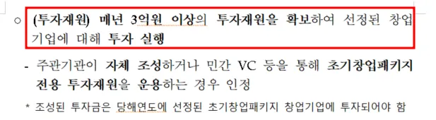 초기 창업패기지 주관기관의 경우 매년 3억원이상의 투자재원을 창업기업에게 투자해야 함.